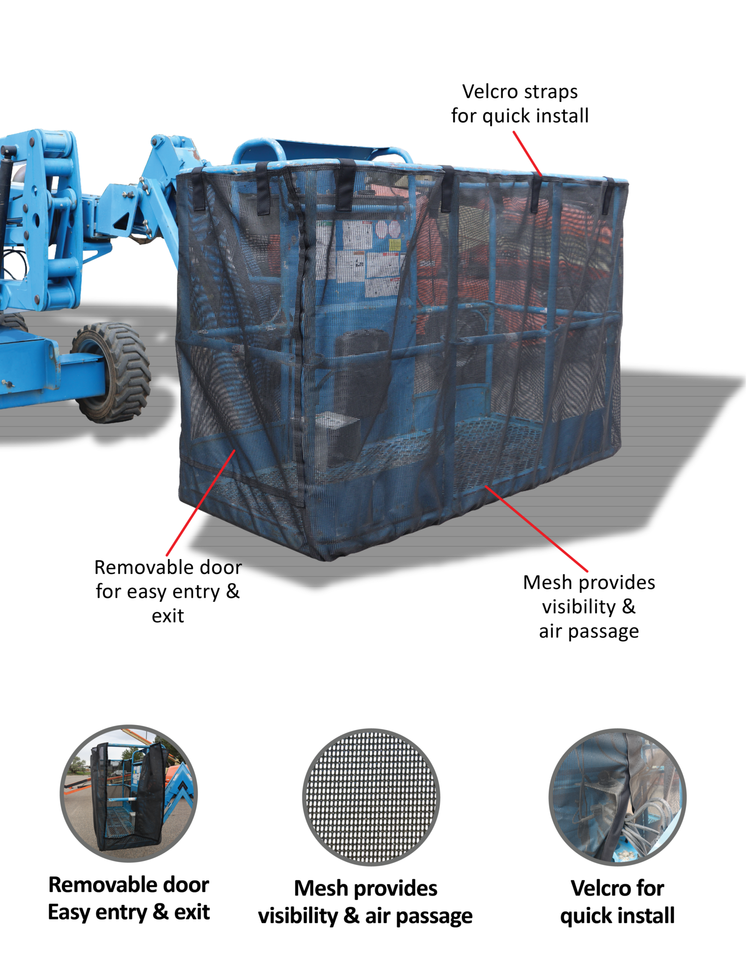 Make your job site safer with our DropShields®. These mesh covers prevent tools and small parts from falling out of the boom basket or scissor lift platform. They reduce the risk of injuries or damage caused by objects falling from working heights.